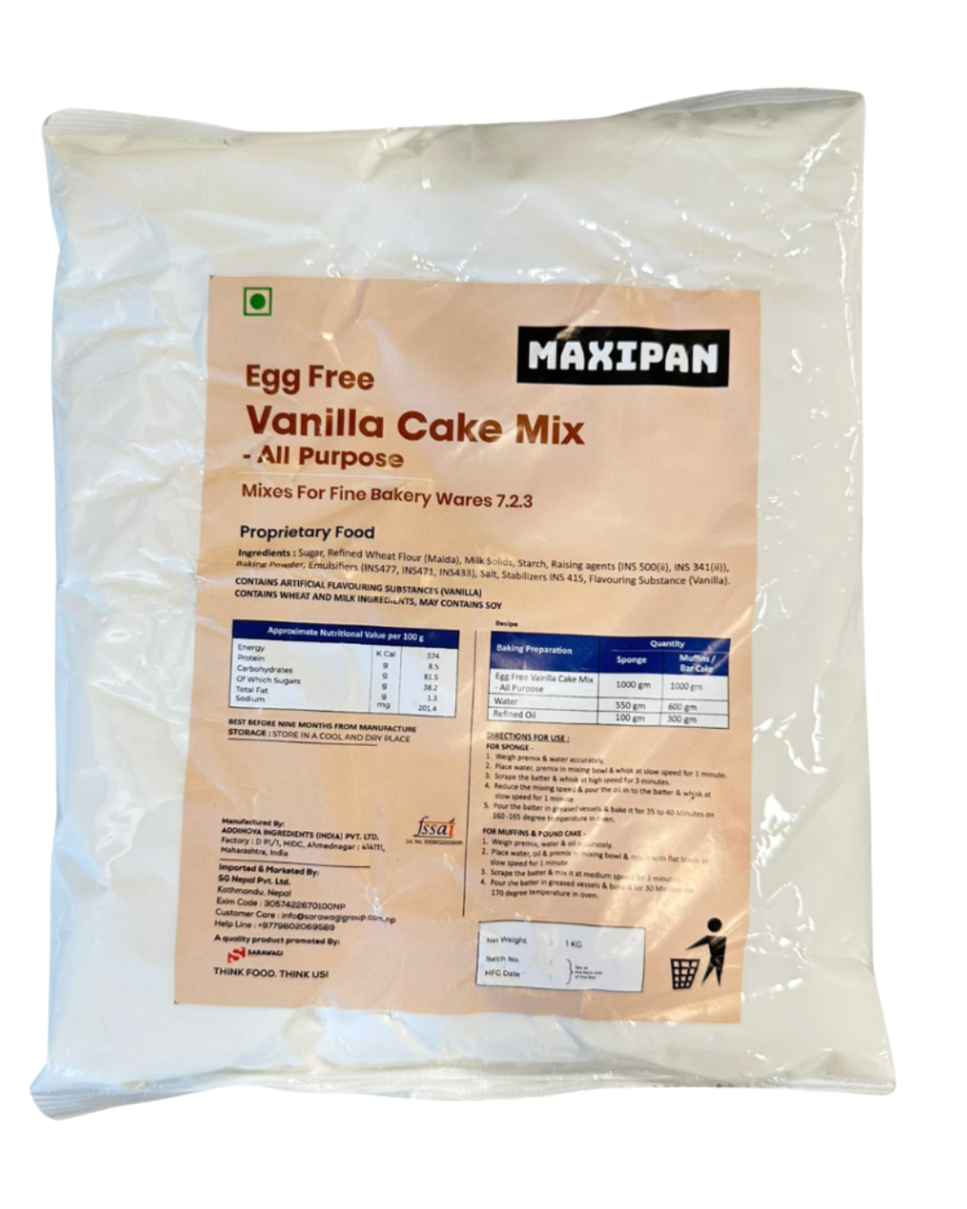 Maxipan Egg Free Vanilla Cake Mix (All Purpose) is a versatile, ready-to-bake powder blend designed for creating soft, fluffy vanilla cakes without eggs, making it an essential for vegetarian baking in Nepal's homes, bakeries, and cafés.