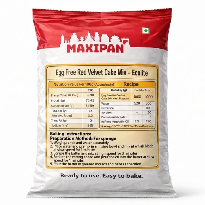Eggless Red Velvet Cake Mix Ecolite is a convenient baking premix designed to produce soft, moist, and vibrant red velvet cakes without the use of eggs. It contains a balanced blend of wheat flour, sugar, cocoa solids, milk solids, and raising agents that help deliver consistent texture, good volume, and a fine crumb structure in baked cakes.
