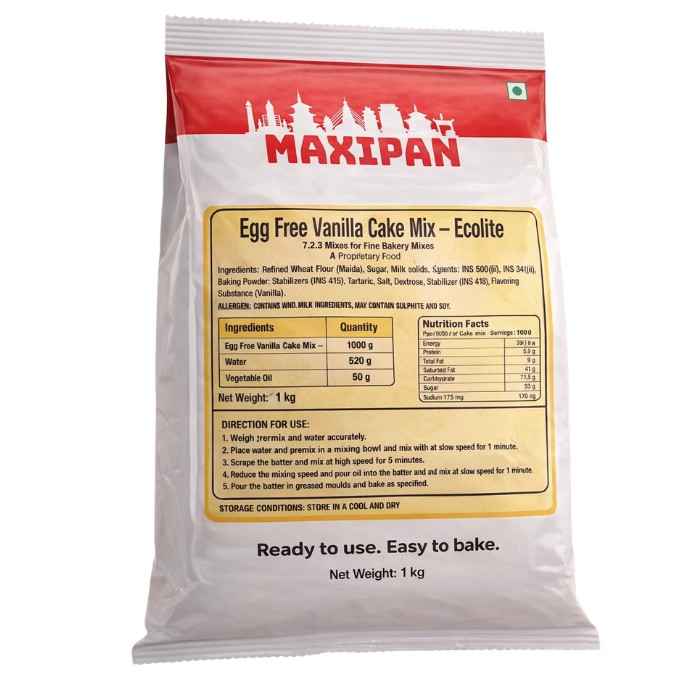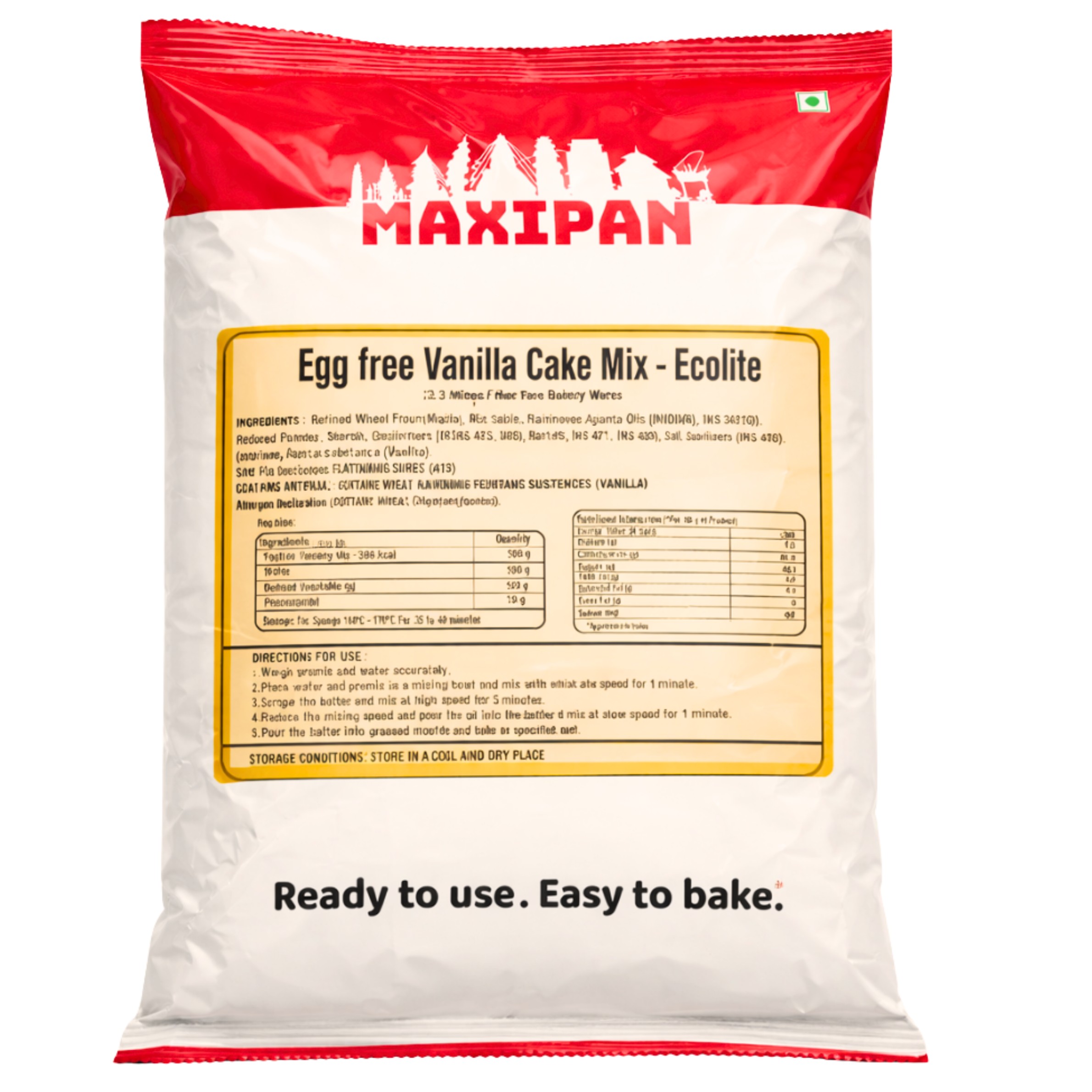 Maxipan Eggless Vanilla Cake Mix Ecolite is a premium quality cake mix crafted for quick, soft, and delicious vanilla cakes completely eggless. It offers a smooth texture, rich vanilla aroma, and consistent results, making it perfect for both home baking and commercial use.