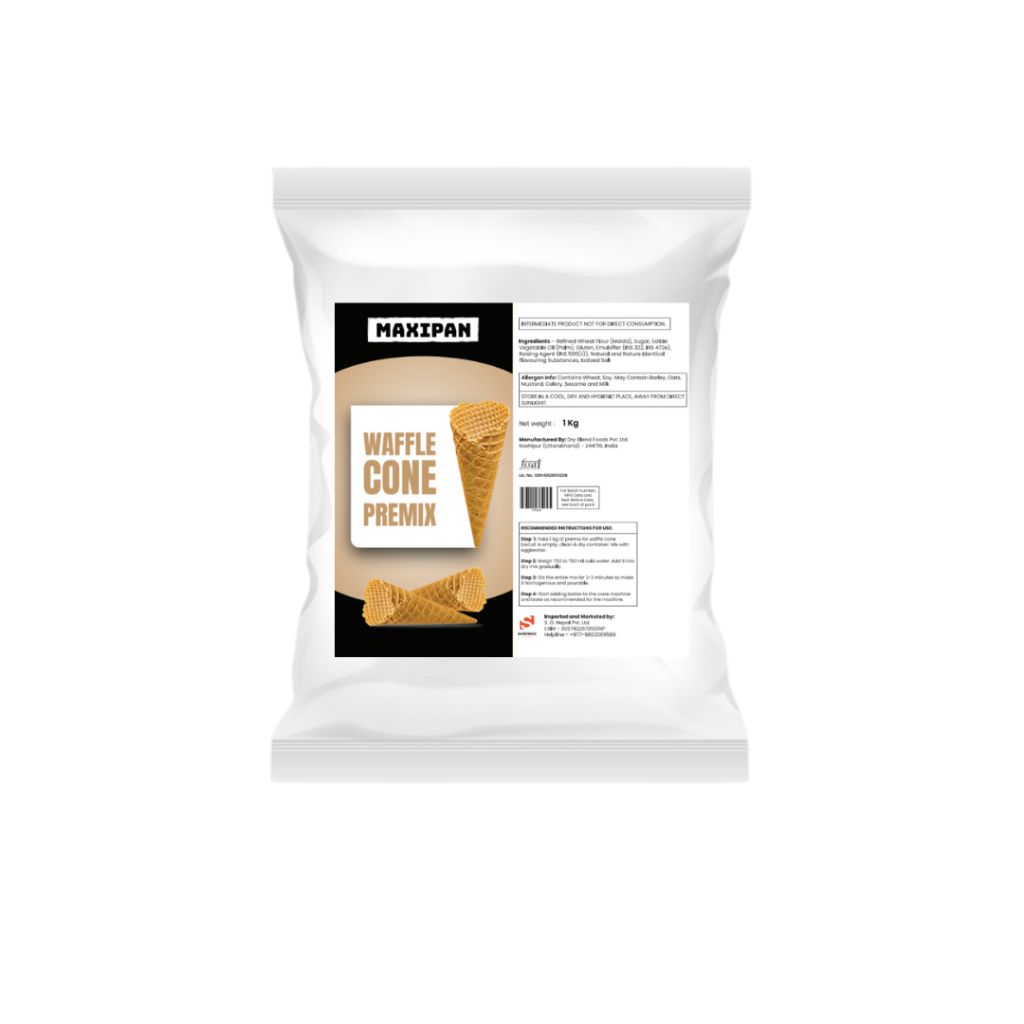 Elevate your ice cream and dessert offerings with Maxipan Waffle Cone Mix - 1kg, a premium ready-to-use premix from Sarawagi Group’s MAXIPAN brand, crafted for professional ice cream parlors, cafes, bakeries, and home enthusiasts. This versatile, eggless powder blend combines wheat flour, sugar, leavening agents, and natural vanilla for a sweet, buttery flavor, producing light, crispy waffle cones with a golden-brown exterior and subtle crunch. Simply add water to create a smooth batter that yields approximately 50-60 standard-sized cones per pack, ensuring consistent results and authentic homemade taste without the hassle of from-scratch recipes.